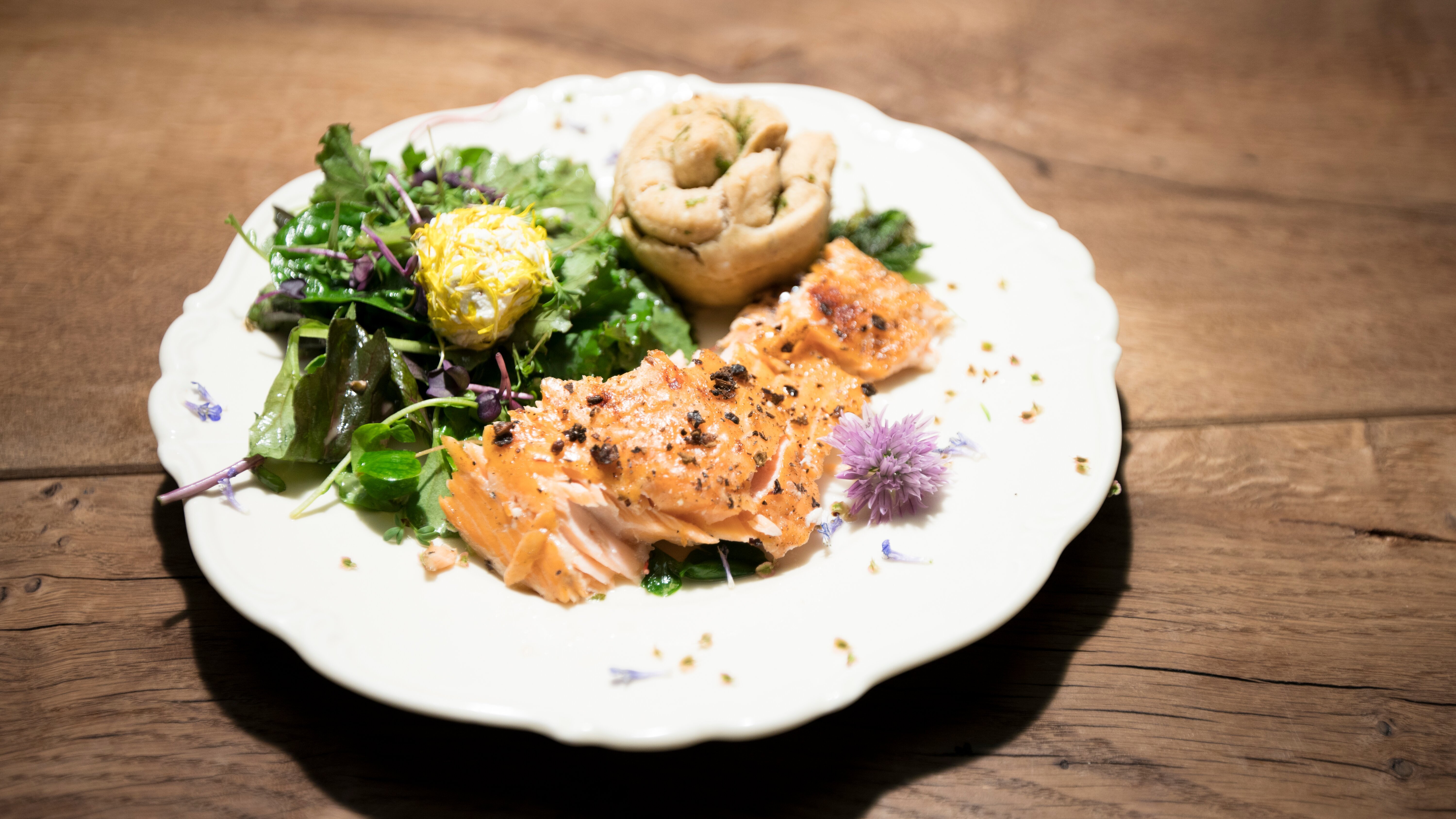 • Lachs vom Brett mit Wildkräutersalat.