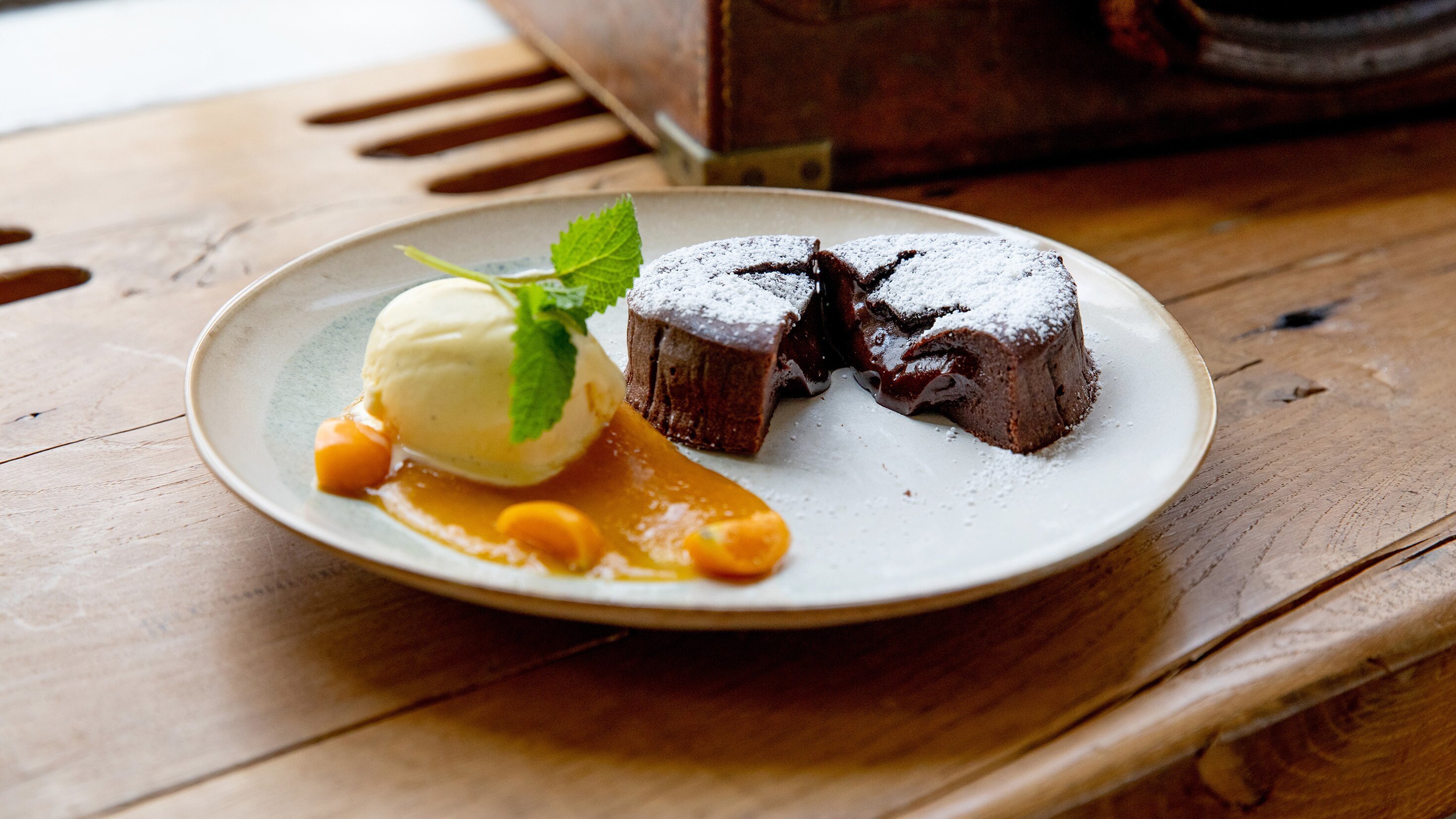 - Schokoladentörtchen mit flüssigem Kern und gelber Fruchtsoße.